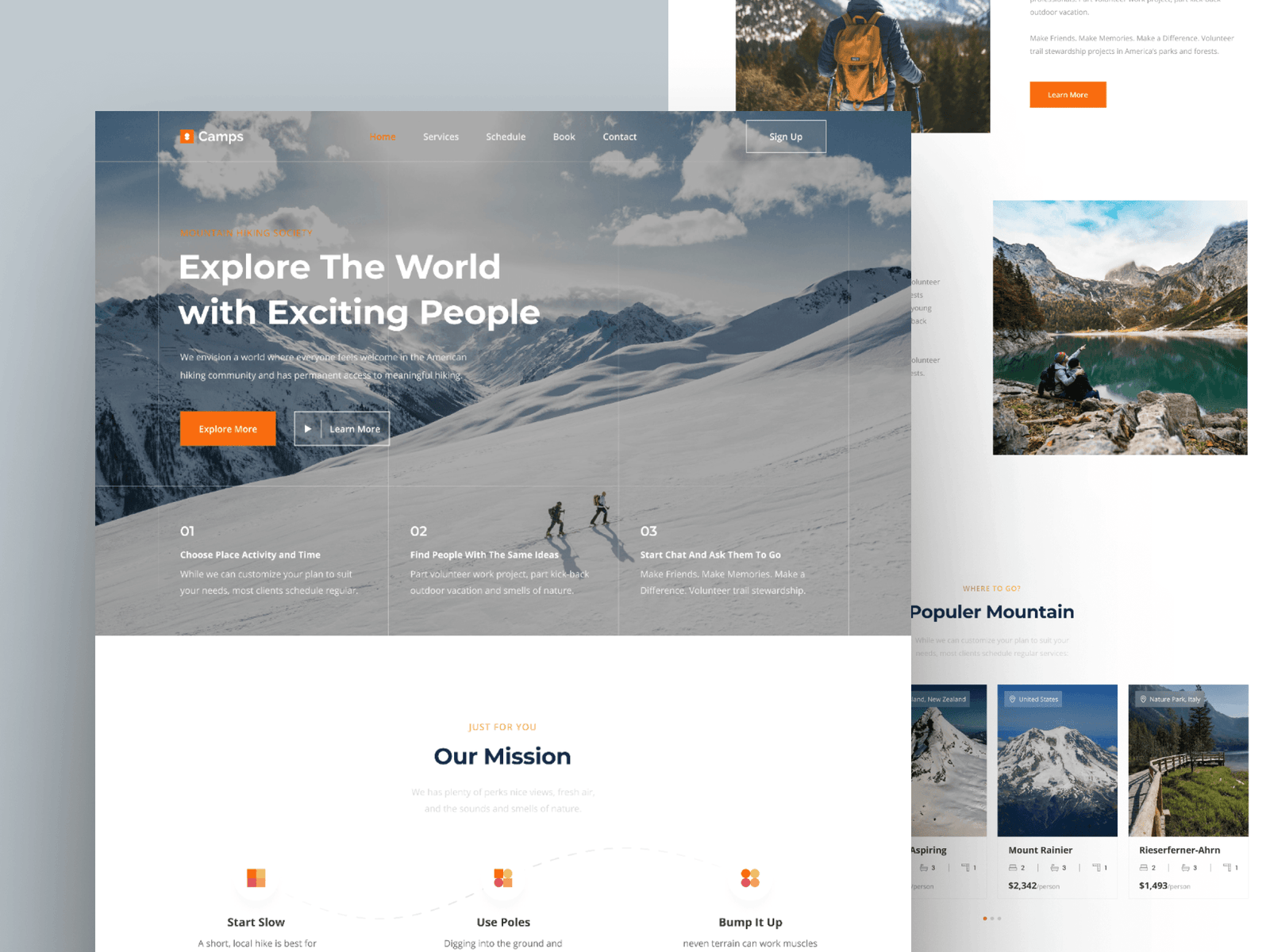 Camps adalah platform yang menghubungkan para pecinta alam dengan petualangan tak terlupakan. Dengan desain web yang bersih dan strategis, kami menghadirkan pengalaman digital yang mencerminkan semangat eksplorasi dan koneksi global, memberikan kesan profesional dan ramah.
